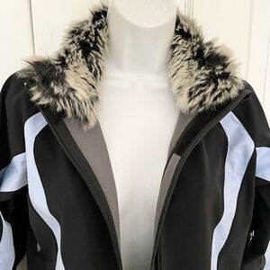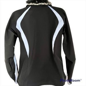 water resistant, black or very dark navy blue and light blue breathable fabric. Has nice stretch to it.