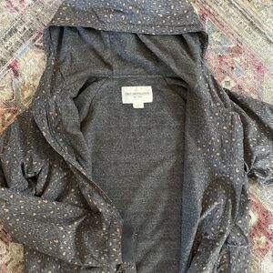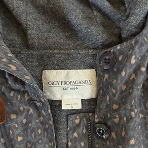 Obey Jacket with subtle cheetah print with fleece lining. Size small. This jacket is the perfect weight for all types of weather. It’s water resistant and has a warm fleece lining. Pet free and smoke free home.