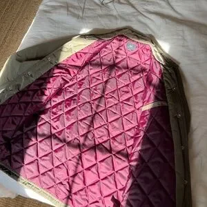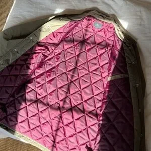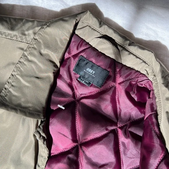 Olive green light jacket from Obey. Worn only a couple of times, no marks or scuffs. Burgundy interior with pocket. Small but fits more like a medium and I can wear a hoodie underneath no problem. It's super cute, I just don't seem to grab it as often!