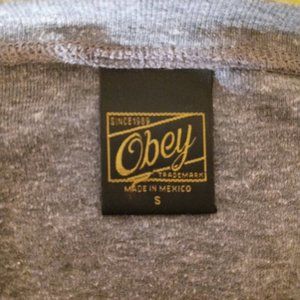 Grey Obey sweatshirt, wide neck. Thin cotton, almost jersey feeling to it.