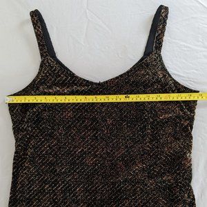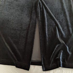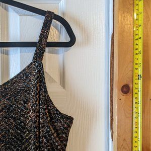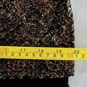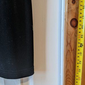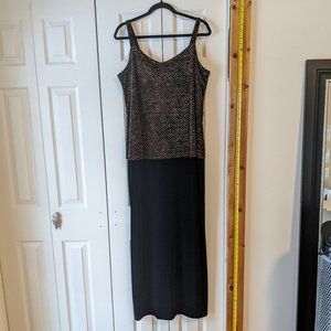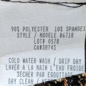 This dress and jacket set is black and burnt gold, size 14. Made in Canada, good stretch to the fabric and very comfortable. Flattering and can add modesty with the jacket.