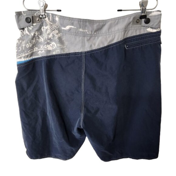 Stay cool and comfortable with these stylish and functional OP Sport men’s swim trunks in size XL. These trunks feature a light gray front panel with navy blue sides and bold blue and white accent stripes, topped with subtle white graphic prints for a modern beach-ready look.