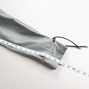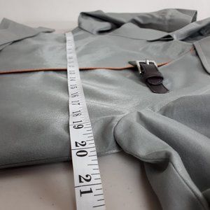 An elegant coat in a beautiful sage green hue with a slight shimmer. It has a magnetic button closure on the collar and a buckle fastener at the neckline for extra coverage. The front fastens with snap buttons, it has slit pockets and there's a pleat at the back for added comfort. Perfect for spring and fall. New without tags. Excellent condition.
