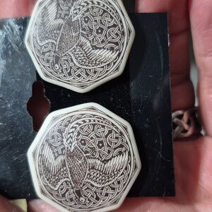 Unique octagonal earrings with intricate Celtic partidge design. Features black and white colors.