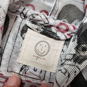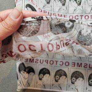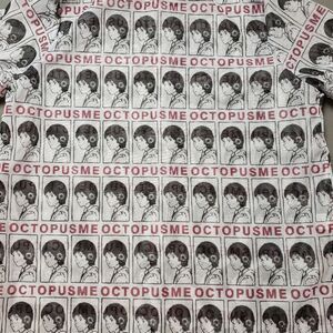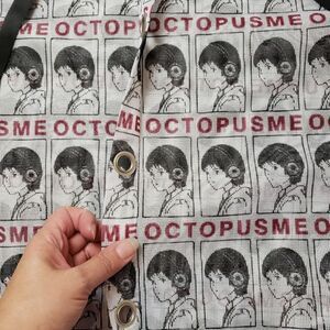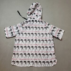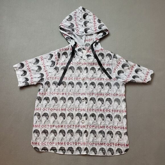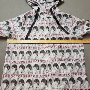 Octopus Me anime short sleeve hooded mesh shirt. this is a very unusual shirt. Very funky with an anime print on the front that says octopus me.. I don't have much information on this brand but it's a very cool shirt. Big eyelets in the front that don't do anything, just for decoration. Does not open in the front it is a pullover. Mood with hood pulls. size medium. Fabric is see through mesh. Measurements in the photographs