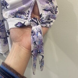Off- the-shoulder top with removable shoulder straps. The top trim is made of a 1.5” elastic band to keep the shirt in place if you prefer to remove the straps. The 3/4 sleeves feature a small slit and tie.