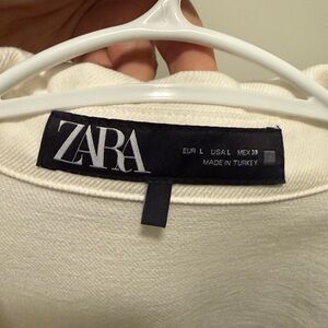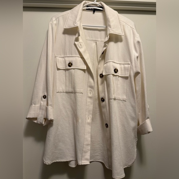 Stylish off white relaxed fit cotton shirt with button-up front. Features two chest pockets. Perfect for layering.