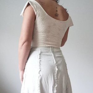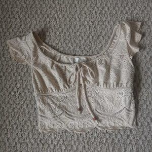 Gorgeous vintage peasant top with lace details and wooden beads. Cap sleeves and stretchy, very flattering