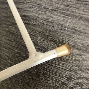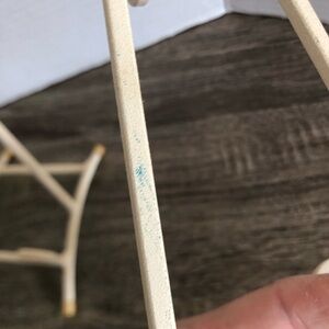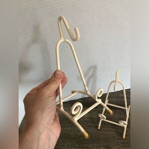 Off white metal holders with rubber stoppers on the feet. Scroll design in the front. Each holds one teacup and one saucer. Note: teacup and saucer shown in photo is not included but is available in my closet.