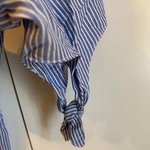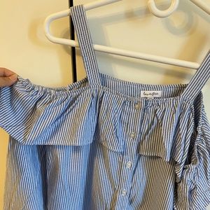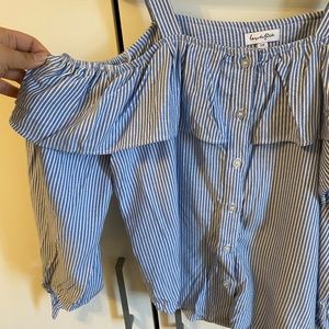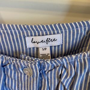 Gently used LoveFire blue and white striped ruffle top with straps and buttons