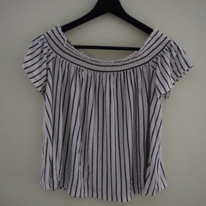 Super cute, off the shoulder from American Eagle. White with navy stripes and elastic band at the top.