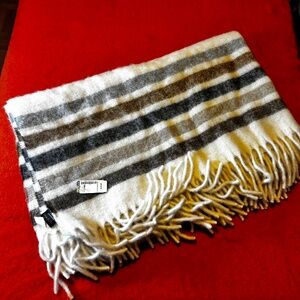 Off white and Earth tone stripes wool and alpaca blend throw made in Italy new with tags. Cozy throw adorned with stripes in natural tones, rich wool, alpaca, polyester, and nylon blend, long fluffy fringes at the ends. Cabin rustic apres ski vibes. 51" x 71" (130 x 180 cm). 47% wool, 27% polyester, 20% alpaca and 6% nylon. This item comes from a smoke free, pets friendly home. Recycled bags/box used when possible. Please, let me know if you'd like any additional info. Thanks for watching!