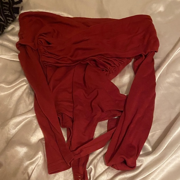 Stylish off-shoulder bodysuit in a rich rust red color. Perfect for a chic look.
