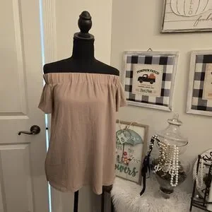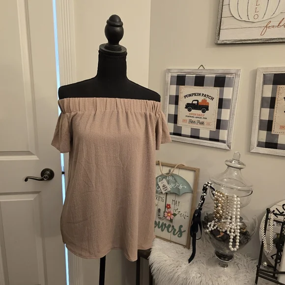 Chic off-shoulder top in a soft Tan color. Perfect for casual outings or dress up with jeans. 100% Polyester. Machine wash in cold water, gentle cycle with like colors. Tumble dry low and low iron.
