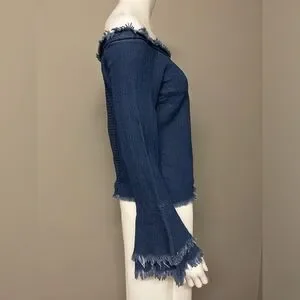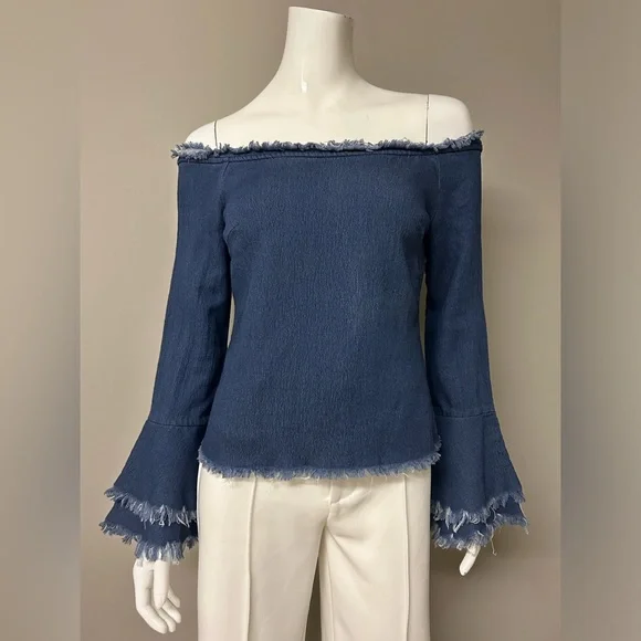 This is an off-the-shoulder long-sleeve top made in a faux denim material. It has layered cuffs with cut-off frills.