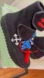 Black high-top sneakers by Off-White. Features striking red and blue details. Signature arrow design on sides.