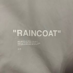 Named Business Casual, the Off-White menswear collection is all about mixing traditional tailoring with the street style vibe that the brand is so well known for. Presenting oversized proportions with references to late eighties and nineties, this collection defines the carefree and relaxed ethos of a new generation. Embellished with a playful "Raincoat" print to the chest and rear, this coat features a hood, long sleeves, an oversized fit, front pockets and a concealed fastening.