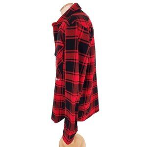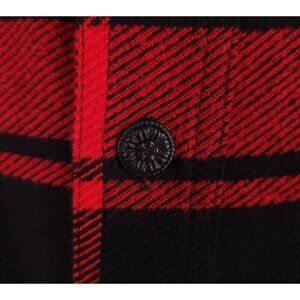 Long sleeve cotton-blend flannel shirt featuring check pattern in tones of red and black.
