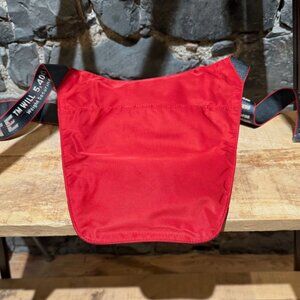 Off-White Red Nylon Industrial Strap Crossbody Bag. Red nylon. Adjustable dark grey logo signature industrial strap featuring ivory Off-White branding with red edge and branded metal tips. Front magnetic flap top pocket, front zip lower compartment with black ring pull engraved "OFF-WHITE c/o VIRGIL ABLOH". Back slip pocket. Gunmetal Off-White logo plaque at the front. Made in Italy. Comes with original tags.