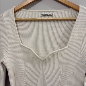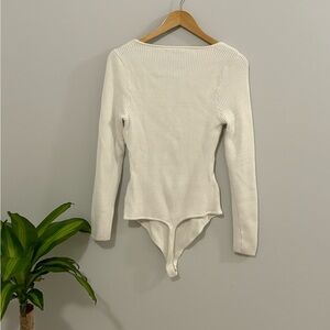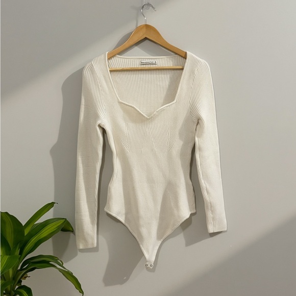 Elegant cream bodysuit. Ribbed texture. Long sleeves. Deep neckline.