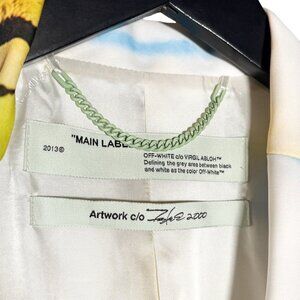 Off-White SS20 Runway Futura Tomboy Spray Oversized Blazer Jacket. Part of Off-White’s SS20 collection, created in artistic collaboration with graffiti and contemporary artist Futura. Multicolour graffiti-inspired spray paint print. Single-breasted one button front closure. Notched lapels. Long sleeves with four (4) enamel round buttons at each cuff. Front welt pocket at chest and two (2) front flap pockets at waist. Pink script signature “Futura” and “C.C. Rocks” on lower left front. Fully lined in white viscose with subtle diagonal Off-White logo pattern. Interior neckline features a mint green chain matching the brand label. Made in Italy. Comes with original tags and extra buttons.