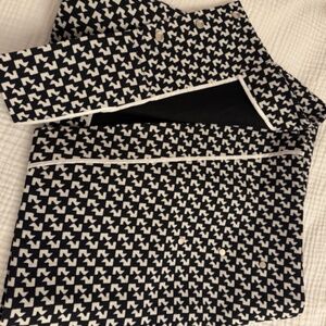 Off-white ladies bottoms. Fashion category: skirts. Off-white ladies white black abstract-print wrap skirt. A virgin wool blend skirt featuring a wrap design, a high waist, off-centre front button fastening, and an allover abstract pattern print. Virgin wool 58%, polyester 42%.