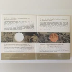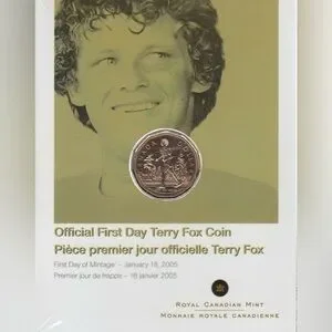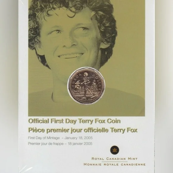 Commemorative Terry Fox coin. Features Canadian dollar design. First day of mintage.