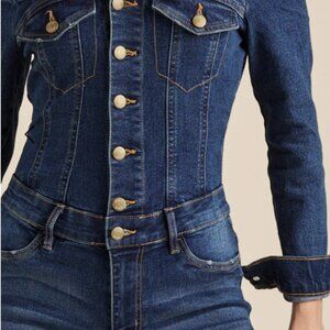 From folded off-the-shoulder neckline to ankle-length hem, this jumpsuit is an easy addition to your wardrobe. Slightly distressed edges give balance to the sleek shape with vertical seams that flatter. The button front and flap pockets stay true to the classic blues you love, but in an instant outfit!