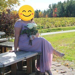 Size 16 David's Bridal bridesmaid dress, color quartz (cool-tone mauve). Purchased June 2019, worn once. Cost me $200 CAD plus $40 to dry clean. It has remained hung up in a garment bag since October 2019.