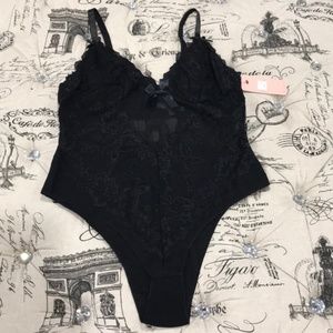 Elegant floral lace and a plunging neck accentuate the romantic feel of this sheer bodysuit.