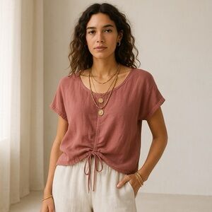 Soft crinkled 100% cotton gauze blouse in a rosy pink with scoop neckline, short sleeves, and signature adjustable off‑center ruched hem tie for customizable shape.