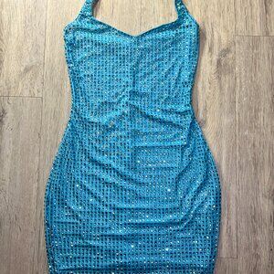 Oh Polly Amolika Embellished Halterneck Mini Dress in Aqua Blue