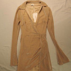 Designed in our dreamy champagne knit fabric, the dress features ultra long flared sleeves and a super plunging shirt collar. Wrap detailing works to cinch your shape whilst a draping belt tie and asymmetric hemline finishes the look. We’re styling this with chic mules and mini bag for a ‘fit with maximum impact.
