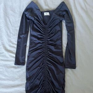 Oh Polly Get Down Tonight Ruche Bardot Mini Dress in Midnight Blue, Size 0.
