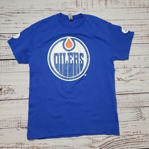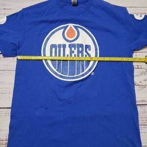 Good used condition, small stain on front as pictured. Oilers McDonald's game day employee shirt. $3 big mac advertising. Gildan Medium shirt. Photos show condition. No holes or rips. Measurements in the photos.