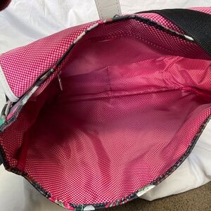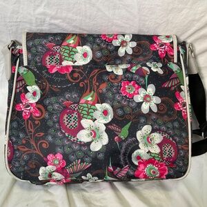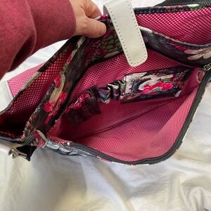 This crossbody/messenger bag is in clean, good condition, though there is some cracking of the trim, where the flap folds over the bag. This is a really cute patterned bag, and the lining is clean. There are pockets on both the front flap and the back of the bag, as well as a large zippered pocket on the front, with various cellphone, I.D., and pen pockets. The large compartment has a further zippered pocket inside as well.