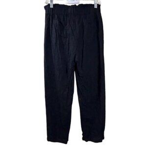 A lightweight, high-waisted rousers with an elasticated or cinched waist that sits high on the body. The design creates a flattering, voluminous silhouette at the top that gradually tapers down the leg.