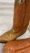 Step out in style with these tan leather cowboy boots with ostrich leather on the vamp. The shaft is a nice orangy tan color that is smooth leather with intricately stitched elaborate embroidered print. Durable and classic western style handcrafted boots perfect for rodeos, Stampede, skijoring, western wear, Halloween, or everyday.