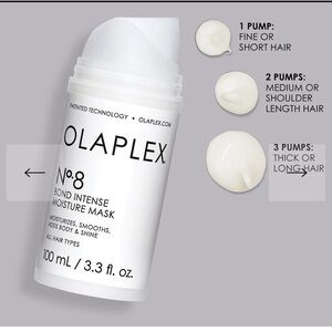 The Nº.8 Bond Intense Moisture Mask, infused with patented OLAPLEX Bond Building technology, is a highly concentrated reparative mask that adds shine, smoothness & body while providing intense, weightless moisture for visibly healthier hair.