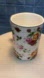 Enjoy your favorite beverage in this elegant floral ceramic mug. Featuring a beautiful design with red, yellow, and green accents on soft pink lace background.
