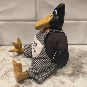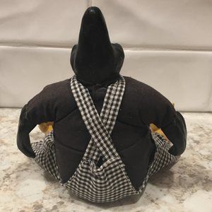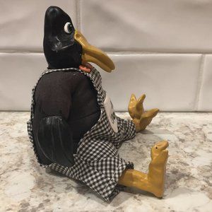 The body is stuffed with soft stuffing on the upper half and has weighted pellets on the bottom half so that this Old Crow will sit upright without tipping over.