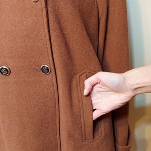 Elegant and warm Melanie Lyne double-breasted pea coat in a luxurious camel tone. Wool blend construction with structured tailoring. Features front welt pockets and a timeless silhouette that elevates any winter outfit.