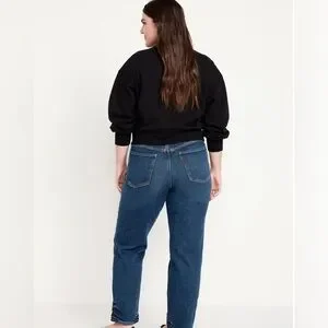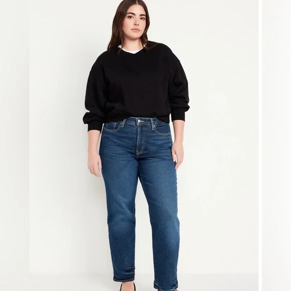 Fashion OG loose denim. Fitted on waist, straight leg, looser through hip/thigh area. 5 pocket detailing, one button and zipper closure. Gold trimming throughout, button has the old navy logo. High waisted, good amount of stretch. Gently used, in good condition.