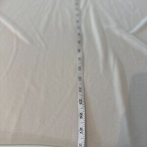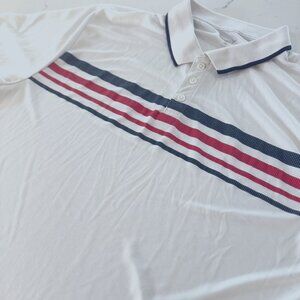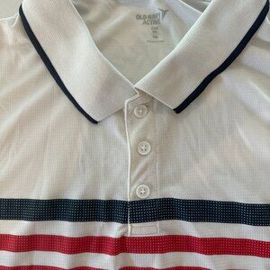 White with navy blue and red horizontal stripes on upper chest. Navy blue trim on collar.