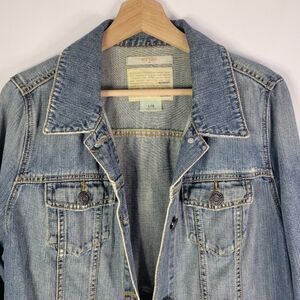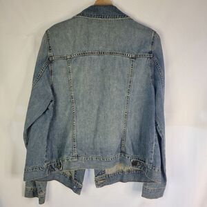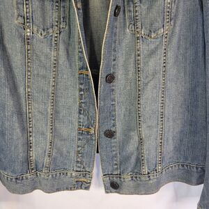 Stylish aged / washed out look blue denim jacket with button closure. Features front pocket and a classic collar. Not sure why it says "maternity" in part of the fabric label, I don't believe this is a maternity garment. The dimensions and structure etc certainly don't suggest that it's anything maternity. Lovely soft denim fabric, not too thick and not too thin, just right. Great for layering or for throwing on after sundown in the summertime. EUC