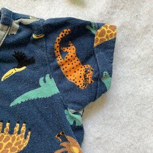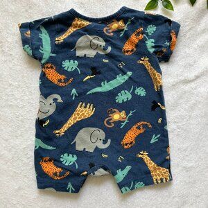 Old Navy baby romper, size 0-3 months. 100% cotton. Navy blue base with an all-over jungle animal print - playful and gender neutral for baby's wardrobe. Snap closures at the neck and bottom for easy changes - perfect for summer, play or layering.