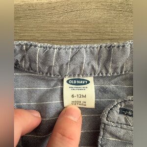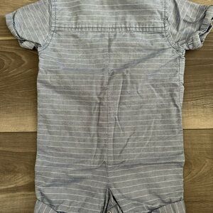 Charming blue striped romper for babies. Features button-up front and short sleeves. Ideal for everyday wear.