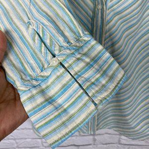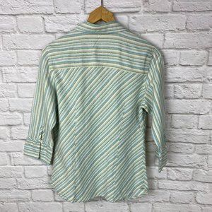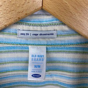 Old Navy - blue, green and cream striped linen blouse with 3/4 length sleeves (see measurements)