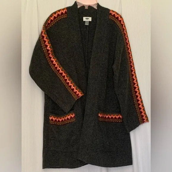 Old Navy Cardigan Open Front Dark Gray with Aztec Trim Detail Pockets Medium