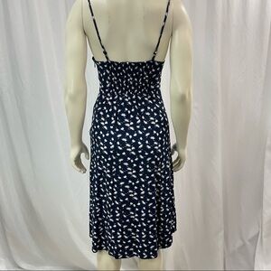 This dress has adjustable straps, an elastic panel in the back so that it is form fitting but leaves room to breathe, and has a zipper on the side. There are a few discoloration spots at the bottom by one of the side seams. it blends so well with the print of the fabric that I didn't notice until I was folding it for storage (see last two pictures). Size XS.